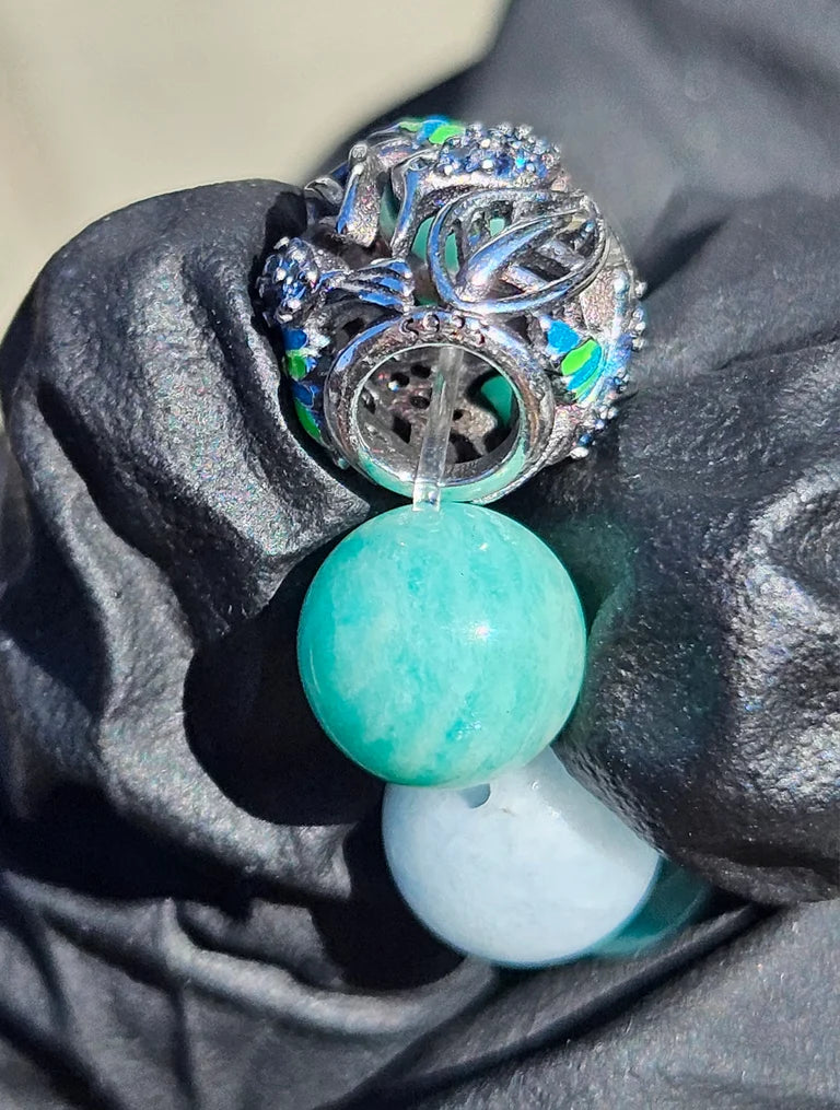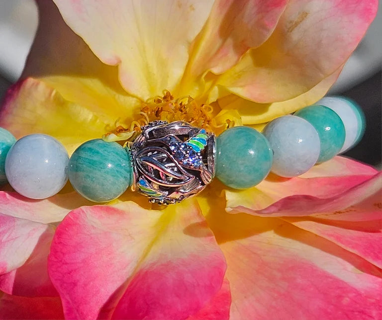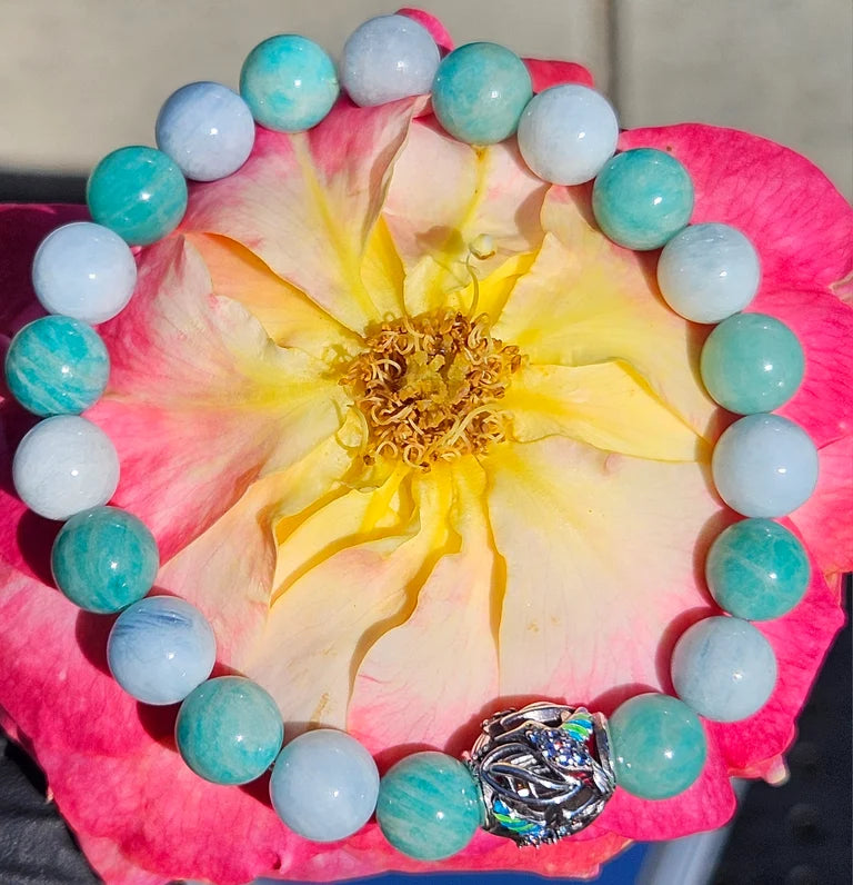 8mm Blue Amazonite and Blue Aquamarine Bracelet. Amazonite and Aquamarine combine for a harmonious blend of soothing energies. Amazonite, the "Stone of Courage and Truth," empowers self-expression and alleviates stress. Aquamarine promotes emotional balance and inner peace. Together, they enhance communication, ease emotional turbulence, and foster authentic self-expression. This combination is ideal for those seeking emotional clarity, courage, and a deeper connection to their inner truth, making it a valuable companion on the journey to emotional healing and self-discovery.